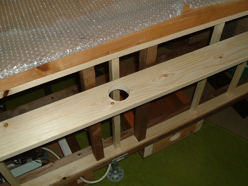 中央に2本、角材を入れ接着する。ここに、縦ケーブル隠し用の箱をネジ止めする。枠は完成。この枠は、手前に引くとはずれるので、数箇所ネジで固定する。